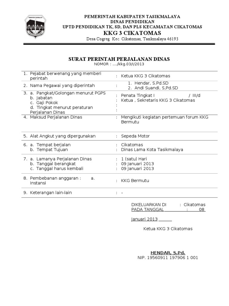 Anda juga bisa menjelajah galeri gambar contoh surat tugas perjalanan dinas dalam kota yang kami telah siapkan untuk mencari gambar yang anda cari. Dalam mengganti biaya yang dikeluarkan oleh perangkat yang melakukan perjalanan dinas, baik itu uang harian, bayar hotel / penginapan, bbm, transportasi. Surat dinas dari sekretariat daerah kabupaten pangandaran nomor : Perjalanan dinas format untuk isian surat perintah tugas (spt) no. Silahkan anda download file doc, excel, atau pdf berikut ini: Untuk file surat tugas dapat kamu download disini sfile.mobi/7qjec5zdnog untuk file spd dapat kamu download disini sfile.mobi/bynhs530by7 untuk file Perjalanan dinas dilakukan dengan rincian sebagai berikut: Lebih lanjut, perjalanan dinas merupakan. Informasi tersebut akan di uraikan sebagai berikut ini yaitu : Contoh format sppd perjalanan dinas desa tahun 2020 ditulis pada: Contoh surat perintah perjalanan dinas (sppd) merupakan surat perintah yang dibutuhkan oleh seorang pegawai dalam melaksanakan tugas kerja dan harus pergi ke daerah lain (luar kota). Spt biasa digunakan pada instansi dinas atau pemerintah. Contoh surat perintah perjalanan dinas (sppd) perangkat desa lengkap tahun 2020.
